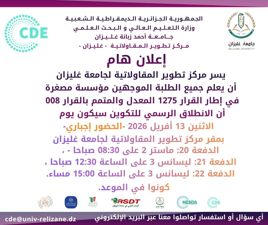 الرئيسية/إعلانات/إعلان هام – مركز تطوير المقاولاتية – آخر الأخبارإعلانات إعلان هام – مركز تطوير المقاولاتية – أقل من دقيقة https://univ-relizane.dz/wp-content/uploads/2026/04/الفيديو-التعريفي-بالمركز-HD-1.mp4 Post Views: 74 أقل من دقيقة فيسبوك X لينكدإن بينتيريست ماسنجر ماسنجر مشاركة عبر البريد طباعة